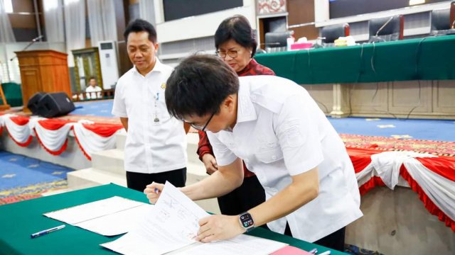 Manado – Walikota Andrei Angouw dan Wakil Walikota Richard Sualang menghadiri Acara Penyerahan Kompensasi Lahan 16% dari PT Papetra Perkasa Utama kepada Pemerintah Kota Manado di ruang serbaguna Kantor Walikota, Rabu (15/11/2023).