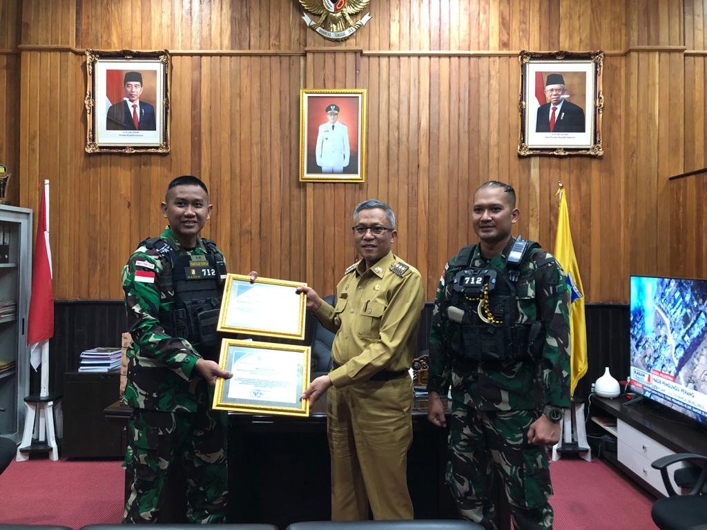 PAPUA,MANADONEWS.CO.ID– Sebagai bentuk apresiasi tanpa batas, Forum Koordinasi Pimpinan Daerah (Forkopimda) dan Pj. Bupati Puncak Jaya H.Tumiran memberikan piagam penghargaan kepada Satgas Pamtas RI-PNG Kewilayahan Yonif 712/Wiratama yang dipimpin Dansatgas Letkol Inf Madiyan Surya, Sabtu (2/12/2023) di kantor Pemerintah Daerah Puncak Jaya.