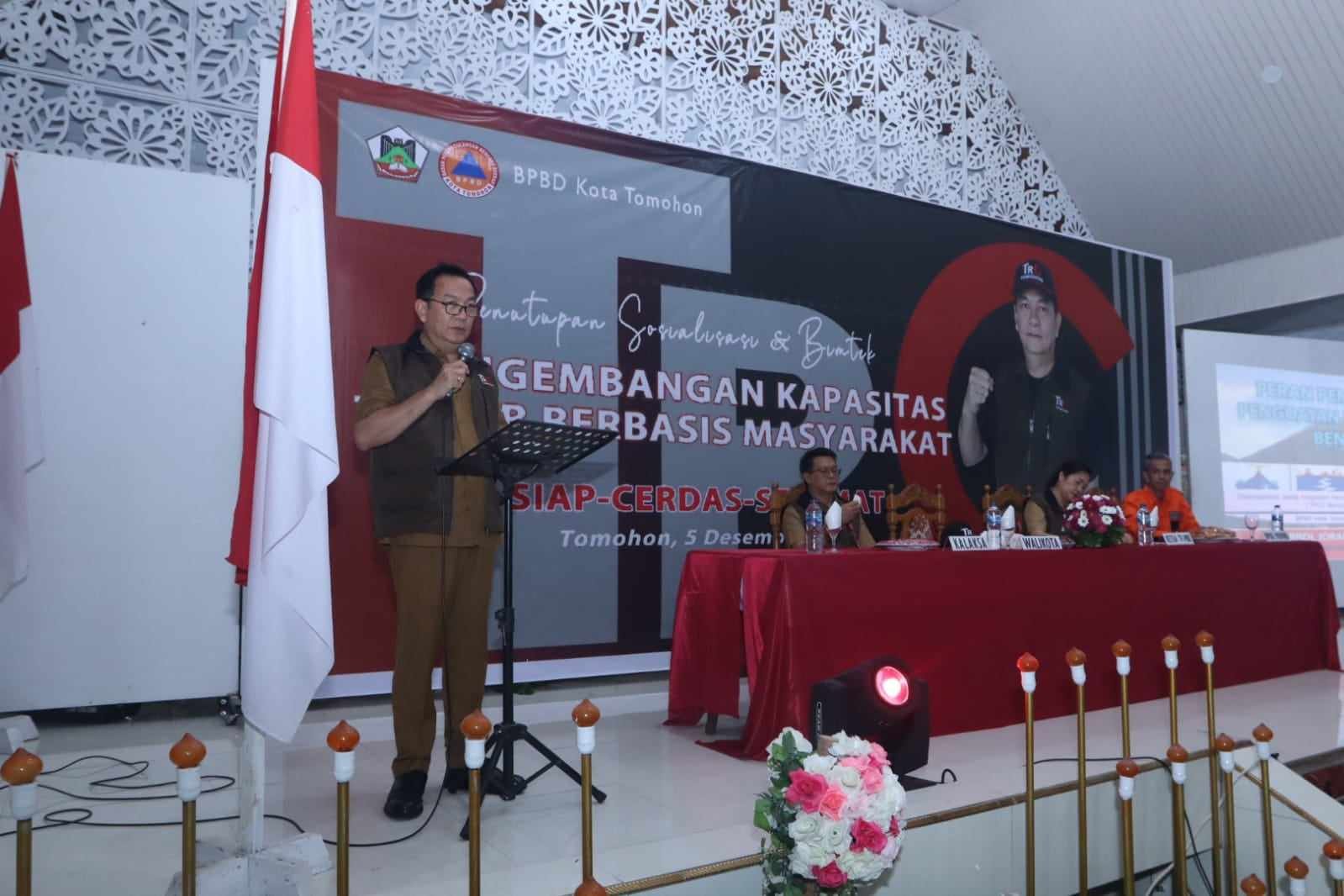 TOMOHON, MANADONEWS.CO.ID – Wali Kota Tomohon Caroll J. A. Senduk SH menutup secara resmi Sosialisasi dan Bimtek Pengembangan Kapasitas TRC-PB (Tim Reaksi Cepat) Penanggulangan Bencana Berbasis Masyarakat di Kota Tomohon,yang digelar BPBD Kota Tomohon, bertempat di Grand Megfra Hall, Selasa (05/12/2023).