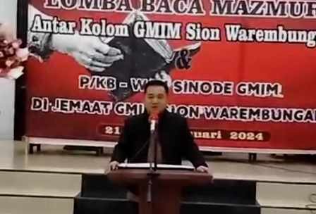Rommy Posma Leke membacakan perikop tentang Mazmur Daud saat ikut lomba baca Mazmur antar Kolom Jemaat GMIM Sion Warembungan, Minggu (21/01/2024).