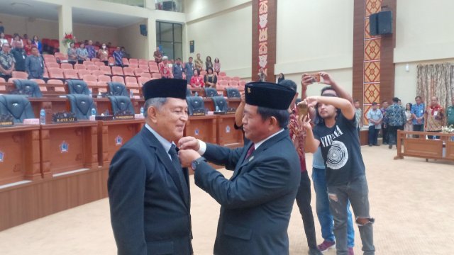 Pemasangan pin anggota oleh ketua DPRD Fransiscus Silangen kepada Tanao Petrus Jangkobus