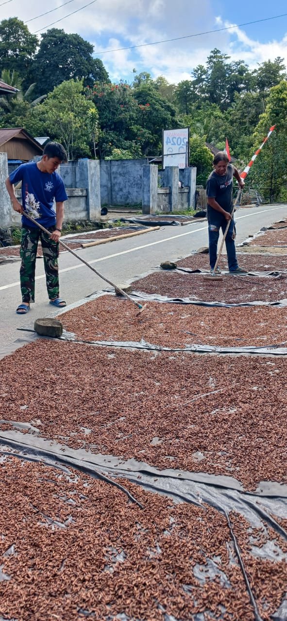 Spontan Serda Guntur disela tugas dan tanggung jawabnya pengerjaan di lokasi TMMD, membantu Bapak Roby Topa menjemur dan membersihkan cengkih tersebut. Ini membuktikan TNI khususnya Satgas TMMD ke-121 masih peduli terhadap hasil-hasil bumi khususnya di bidang pertanian.