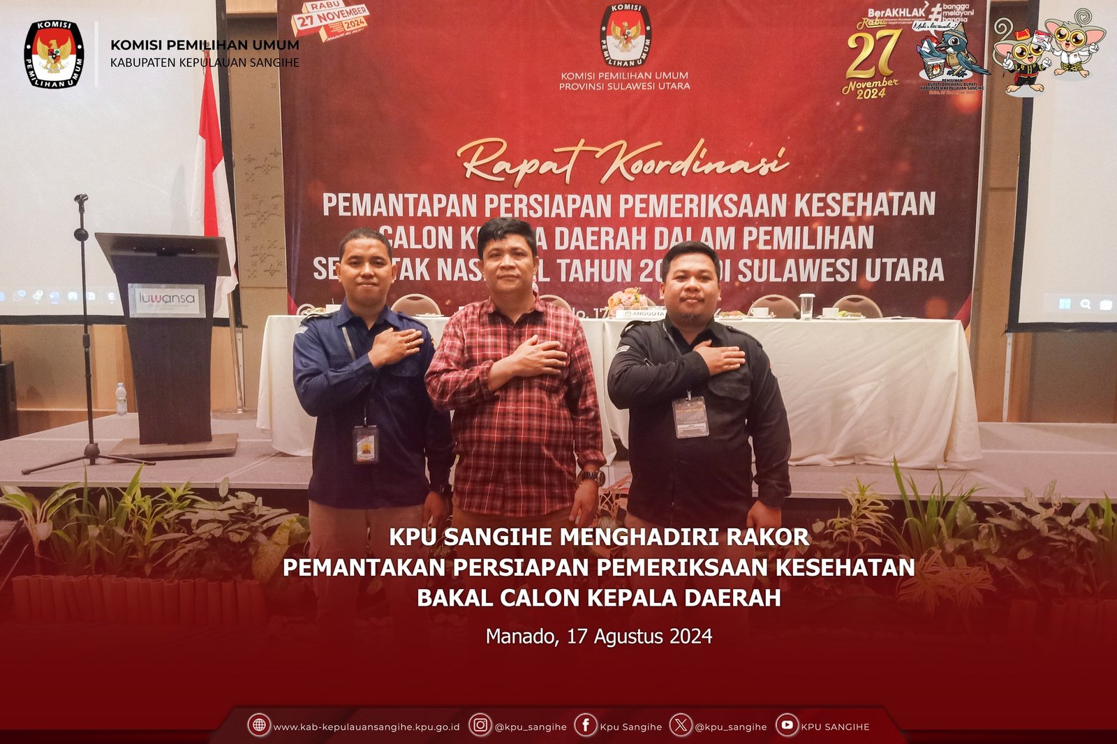 Dalam rangka memantapkan penyelenggaraan tahapan khususnya tahapan Pemeriksaan Kesehatan bagi Bakal Pasangan Calon, KPU Sangihe menghadiri Rapat Koordinasi Pemantapan Persiapan Pemeriksaan Kesehatan Bakal Calon Kepala Daerah dalam Pemilihan Gubernur dan Wakil Gubernur, Bupati dan Wakil Bupati serta Walikota dan Wakil Walikota Tahun 2024 yang di selenggarakan KPU Provinsi Sulawesi Utara di Luwansa Hotel & Convention Center Manado.