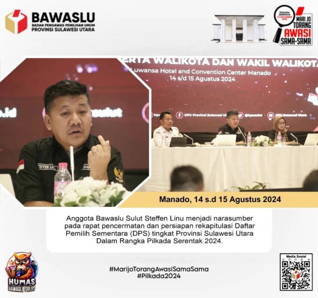 Manadonews.co.id – Anggota Bawaslu Sulawesi Utara (Sulut), Steffen Linu, menjadi narasumber pada rapat pencermatan dan persiapan rekapitulasi Daftar Pemilih Sementara (DPS) tingkat Provinsi Sulut dalam rangka Pilkada Serentak 2024.