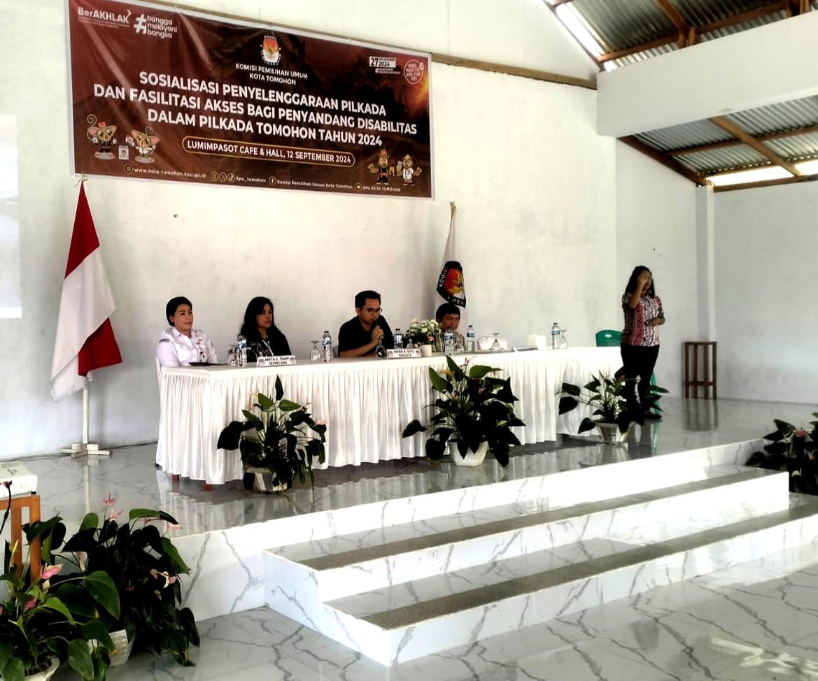 TOMOHON, MANADONEWS.CO.,ID – Komisi Pemilihan Umum (KPU) Kota Tomohon melalui Divisi Sosialisasi Pendidikan Pemilih, Partisipasi Masyarakat dan SDM melaksanakan “Sosialisasi Penyelengaraan Pilkada Dan Fasilitasi Akses Bagi Penyandang Disabilitas Dalam Pilkada Tomohon Tahun 2024.”
