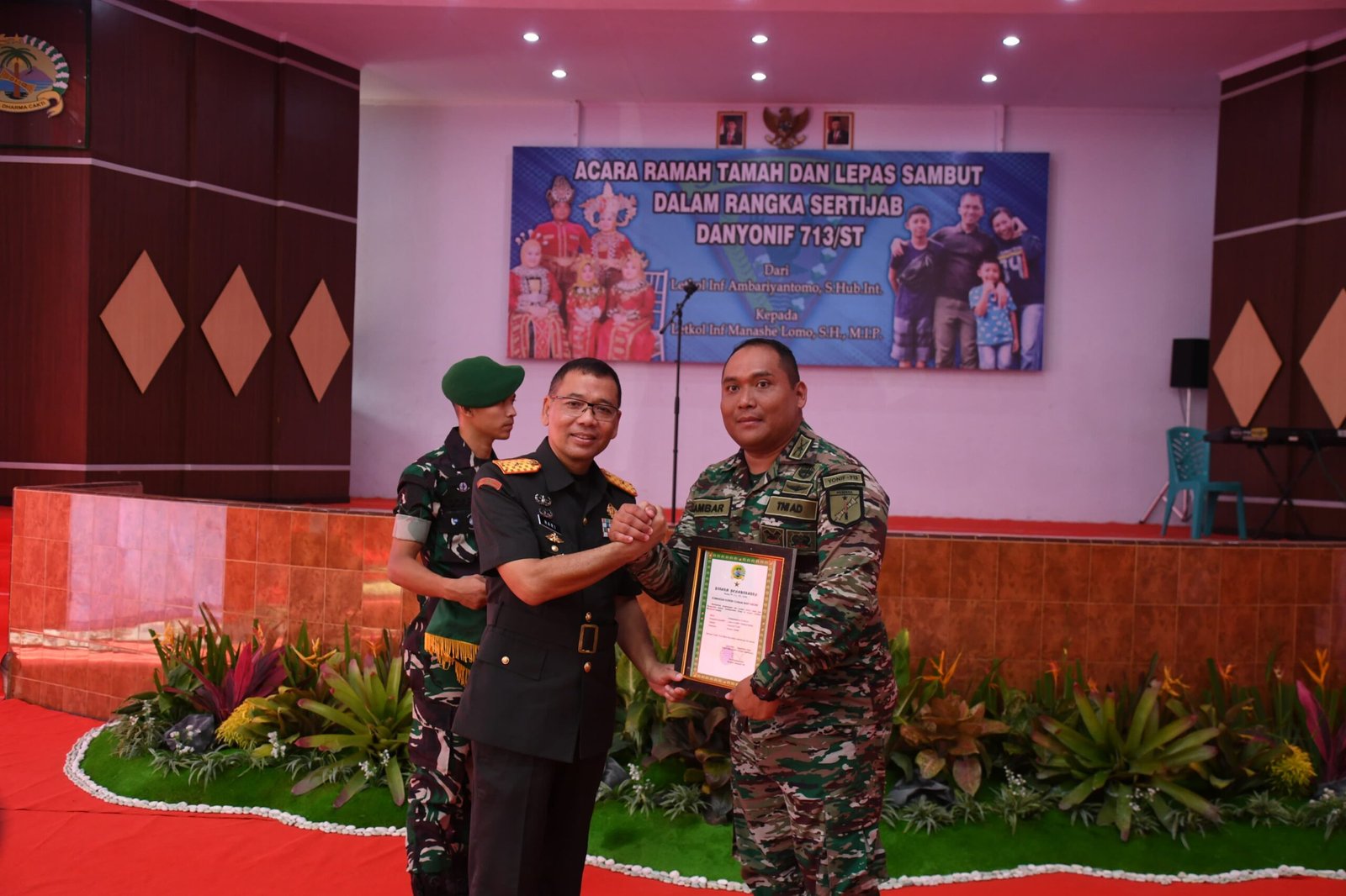 Kepada Letkol Inf Ambariyantomo beserta istri yang akan berpindah tugas sebagai Dansecaba Rindam XIII/Merdeka, Danrem mengucapkan terima kasih dan memberikan apresiasinya atas kerja keras dan keberhasilan yang telah diraih selama menahkodai Yonif 713/Satya Tama.
