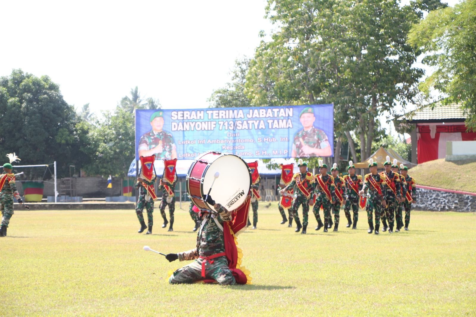 Selain serah terima jabatan juga dilaksanakan serah terima Macan 01 Bass Drum Genderang Satya Tama Lokananta Drum Band yang menjadi kebanggaan Satuan Yonif 713/Satya Tama dari Letkol Inf Ambariyantomo kepada Letkol Inf Manashe Lomo.