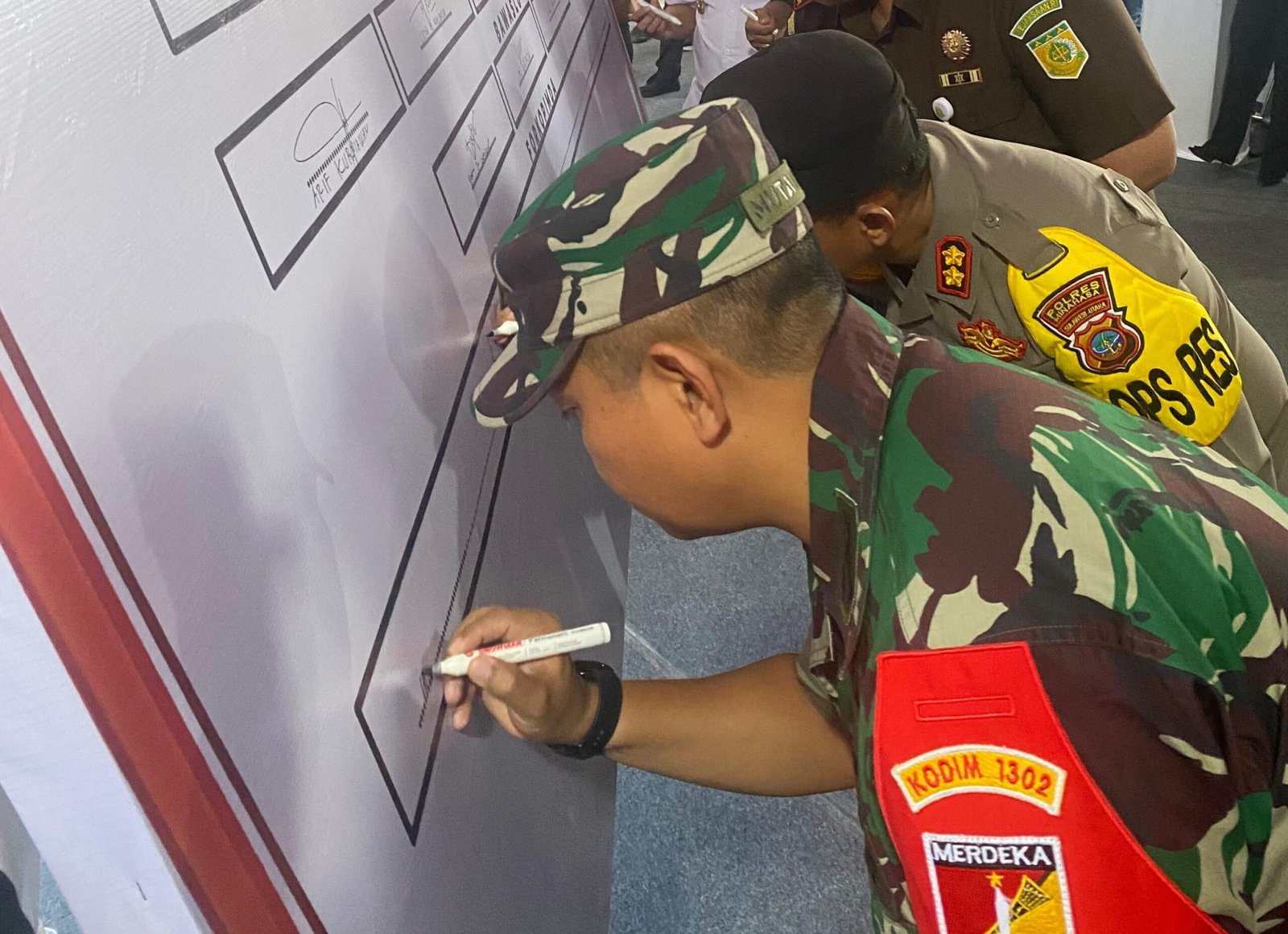 Diketahui, rapat pleno terbuka pengundian dan penetapan nomor urut serta penandatanganan deklarasi kampanye damai tidak hanya dilaksanakan di Kabupaten Minahasa, kegiatan tersebut juga digelar di wilayah Teritorial Kodim 1302/Minahasa yakni di Kabupaten Minahasa Tenggara (Mitra) dihadiri Danramil 1302-11/Ratahan Kapten Arm N. Lutami, Kabupaten Minahasa Selatan (Minsel) dihadiri oleh Pabung Minsel Mayor Inf Rekom Mulyadi, dan di Kota Tomohon dihadiri Pabung Tomohon Mayor Cba Novel Marijan. (Regwilnnlhy/Dirman)