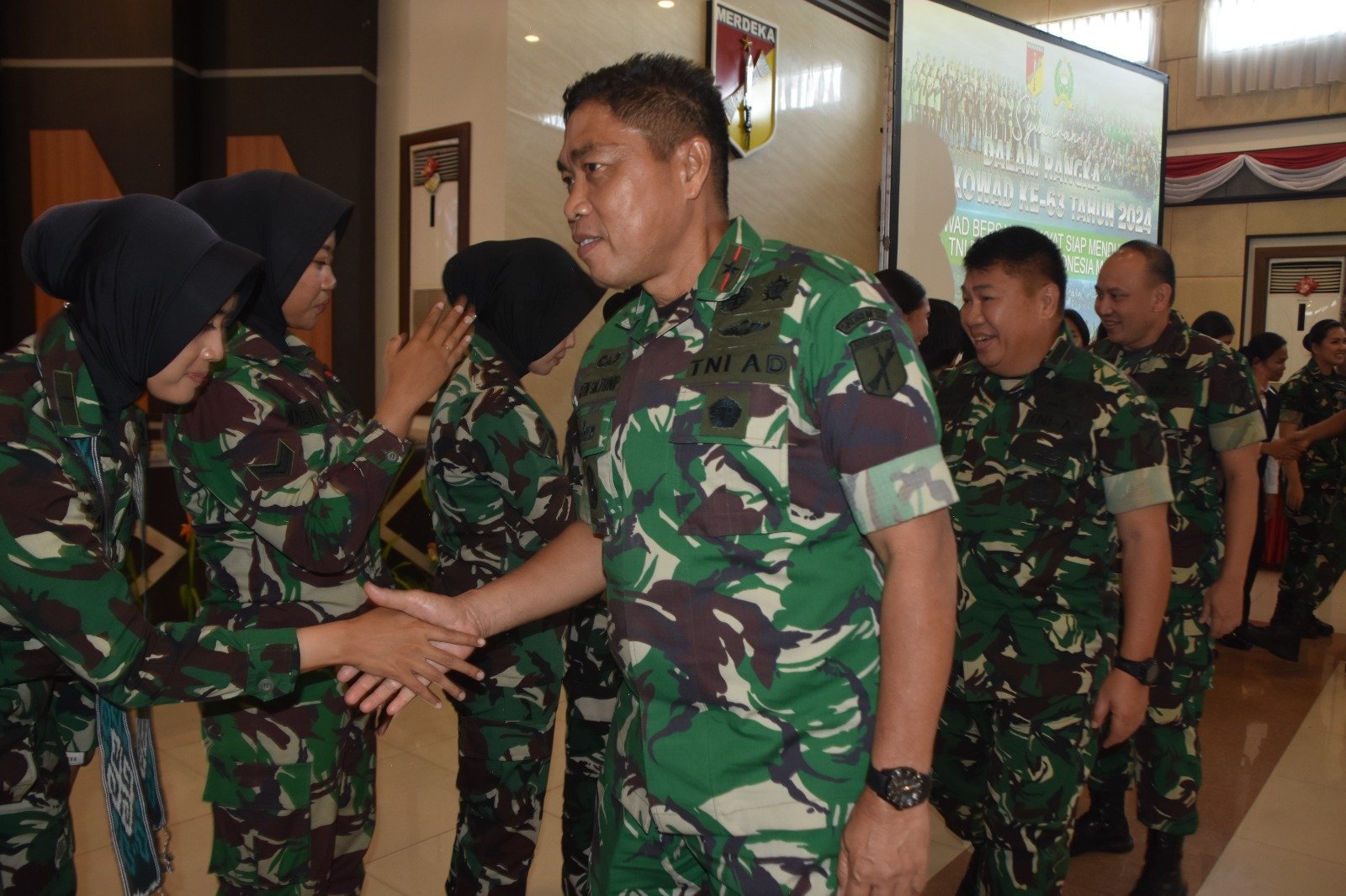 MANADO,MANADONEWS.CO.ID- Komandan Korem 131/Santiago Brigjen TNI Martin Susilo Martopo Turnip menghadiri acara syukuran HUT ke-63 Korps Wanita Angkatan Darat (Kowad) di Grhadika Jaya Sakti Makodam XIII/Merdeka, Manado, Sulawesi Utara, Senin (23/12/2024).