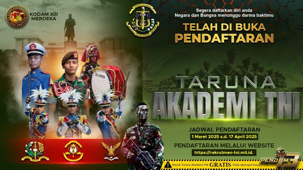 MANADO,MANADONEWS.CO.ID– Kodam XIII/Merdeka kembali membuka pendaftaran bagi calon Taruna Akademi Tentara Nasional Indonesia (TNI) Tahun 2025, pendaftaran berlangsung mulai 3 Maret hingga 17 April 2025.