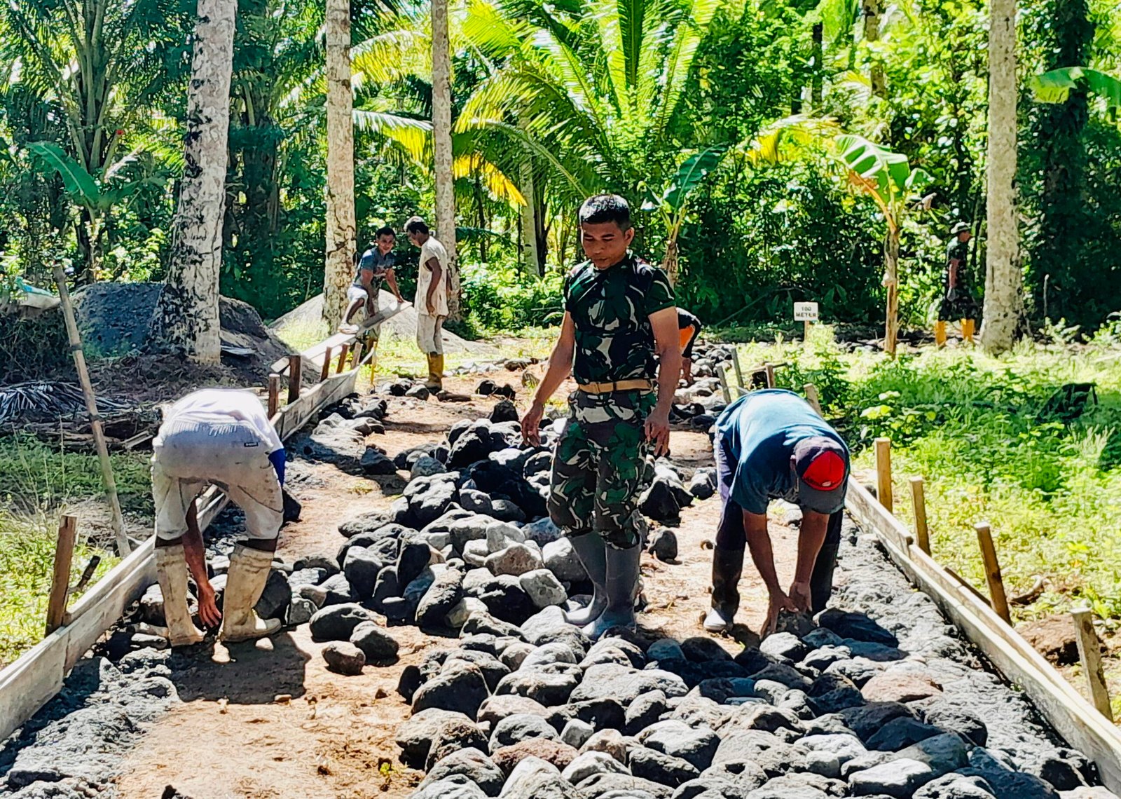 Proses pengerjaan jalan ini di lakukan secara gotong royong oleh anggota TNI bersama warga setempat. Setiap hari, mereka bahu-membahu mengangkut material, mengaduk semen, dan melakukan pengecoran, meskipun di bawah terik matahari.