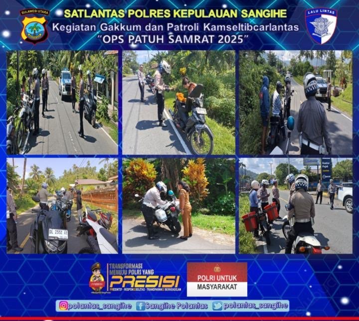 TAHUNA, MANADONEWS.CO.ID – Satuan Lalu Lintas (Satlantas) Polres Kepulauan Sangihe terus menggencarkan Operasi Patuh Samrat 2025 dengan menggelar patroli dan penegakan hukum di wilayah Kecamatan Kendahe dan Tabukan Utara, Selasa (22/7/2025) pagi.
