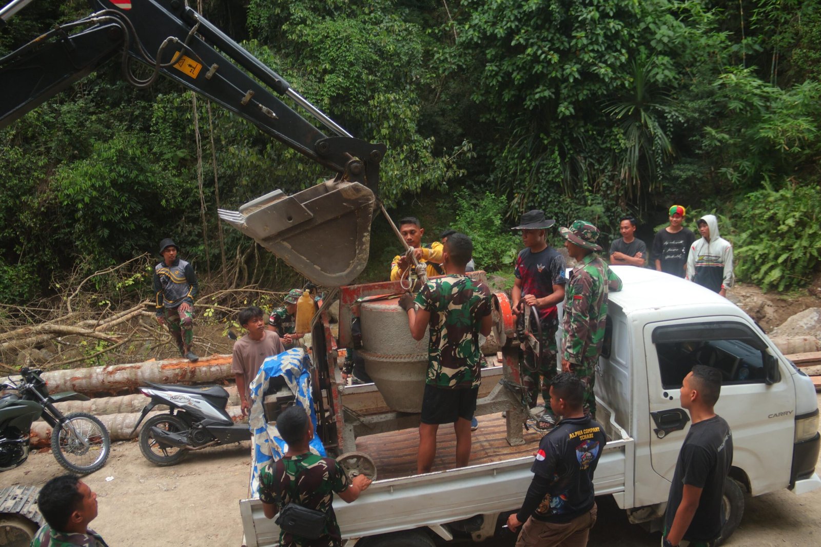 Demi kelancaran dan percepatan pelaksanaan pembangunan infrastruktur di desa sasaran, Satgas TMMD bersama warga setempat memanfaatkan alat berat untuk mengangkut molen yang sebelumnya sulit dipindahkan secara manual akibat medan yang berat dan akses jalan yang terbatas.