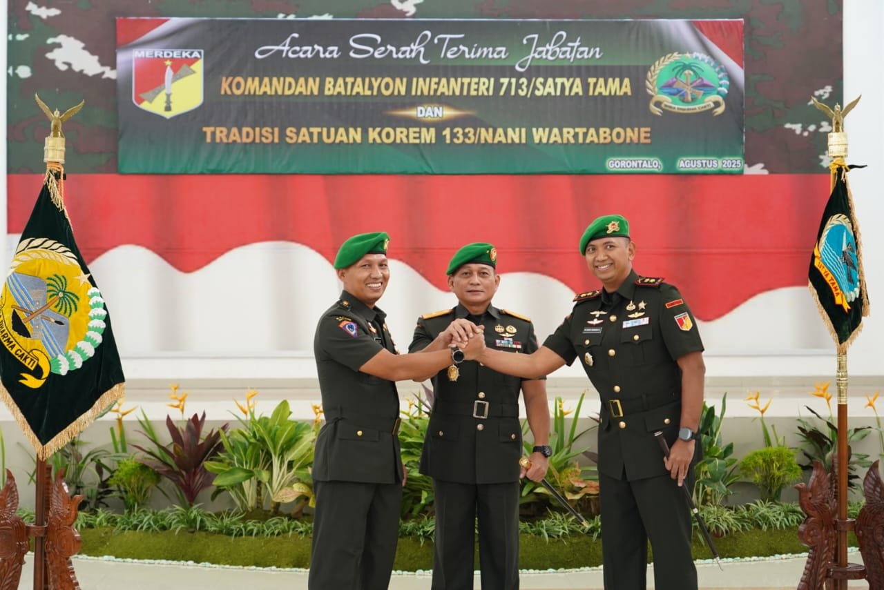 Komandan Korem (Danrem) 133/Nani Wartabone Brigjen TNI Hardo Sihotang memimpin langsung upacara serah terima jabatan Danyonif 713/Satya Tama, yang berlangsung di Aula Kusno Danupoyo Makorem 133/NW, Jalan Trans Sulawesi, Desa Tridharma, Kecamatan Pulubala, Kabupaten Gorontalo, Selasa (19/08/2025).