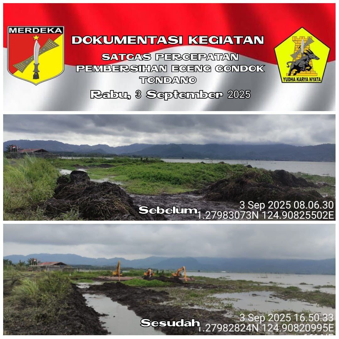 Dalam dua bulan ini Kodam XIII/Merdeka menerjunkan sejumlah anggotanya yakni Yonzipur 19/YKN dan Kodim 1302/Minahasa untuk membersihkan sedimentasi, eceng gondok, dan vegetasi liar, yang ada di Danau Tondano Kelurahan Tonsaru, Kecamatan Tondano Selatan, Kabupaten Minahasa, Sulawesi Utara.