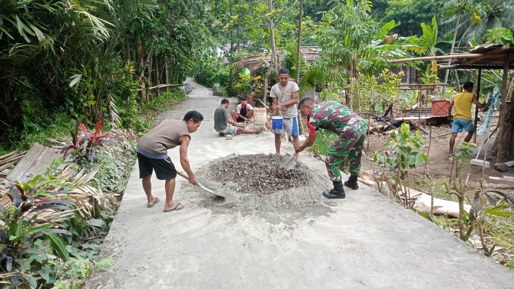 Pengecoran jalan dilakukan secara gotong-royong, sehingga tidak hanya meningkatkan kualitas infrastruktur, tetapi juga memperkuat kebersamaan antara Babinsa dan masyarakat.