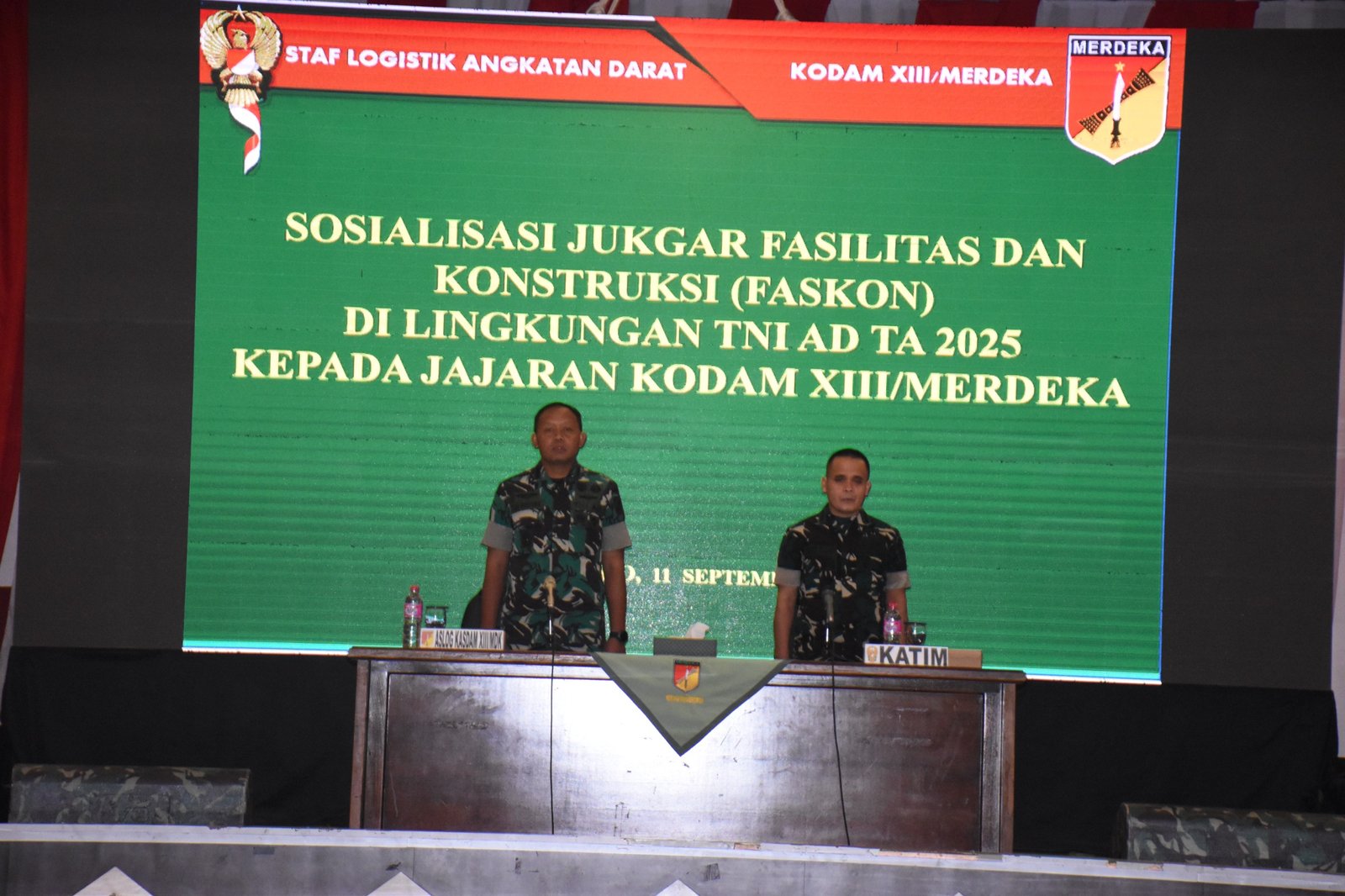 MANADO,MANADONEWS.CO.ID- Asisten Logistik (Aslog) Kasdam XIII/Merdeka Kolonel Arh Sry Rusyono didampingi Pabandya-1/Minlog Slogad Letkol Cpl Eko Yuyus Heri membuka Sosialisasi Jukgar Fasilitas dan Konstruksi (Faskon) di Lingkungan TNI AD TA 2025 jajaran Kodam XIII/Merdeka, Kamis (11/9/2025) bertempat di Grhadika Jaya Sakti Makodam XIII/Merdeka, Kota Manado, Sulawesi Utara.