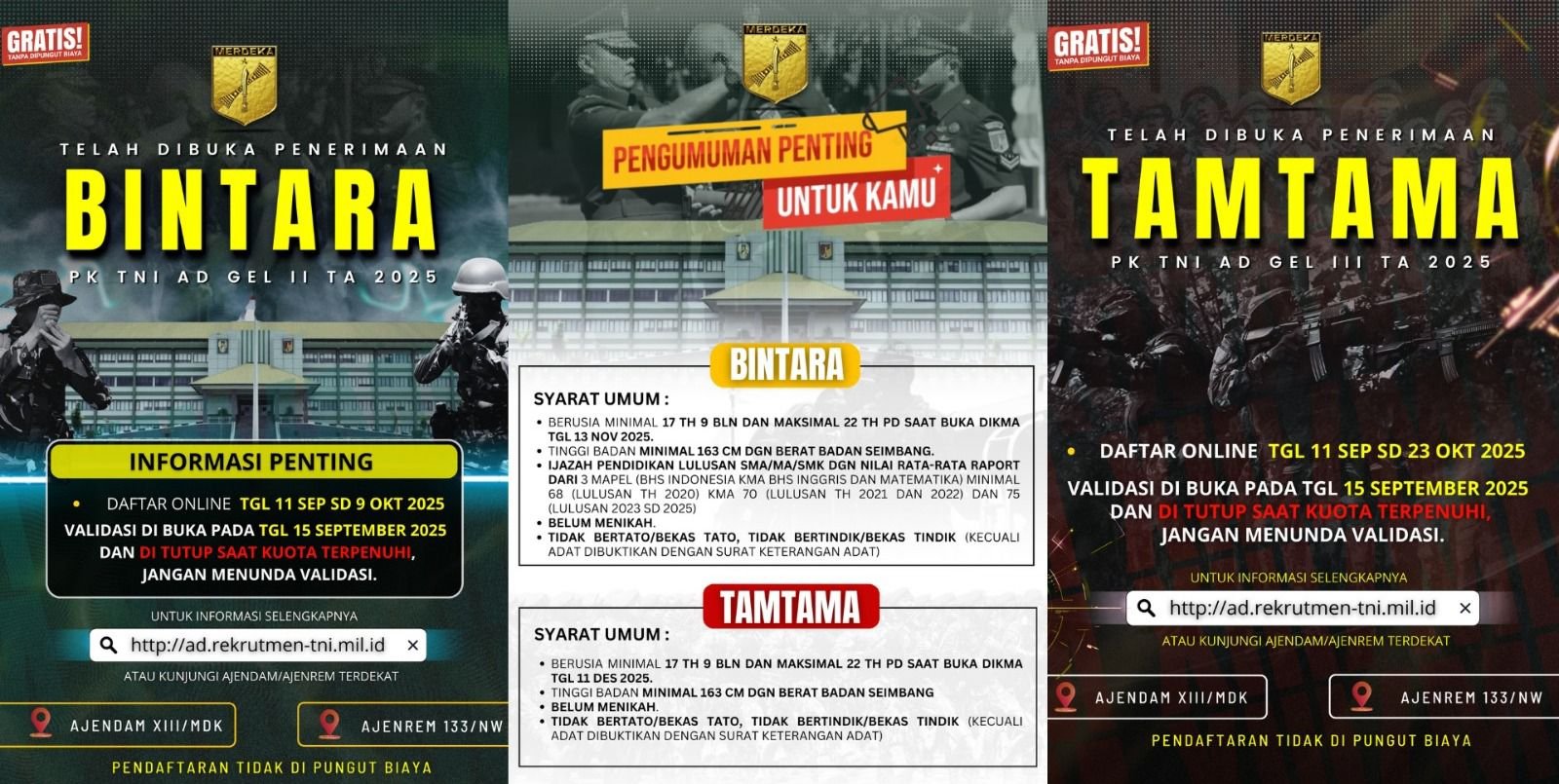 “Telah Dibuka Penerimaan Bintara PK TNI AD gelombang II dan Tamtama PK TNI AD gelombang III Tahun Anggaran 2025. Ayo bergabung bersama kami menjaga NKRI,” kata Kaajendam XIII/Merdeka Kolonel Caj Yermia A. Agvianto, Kamis (11/9/2025).