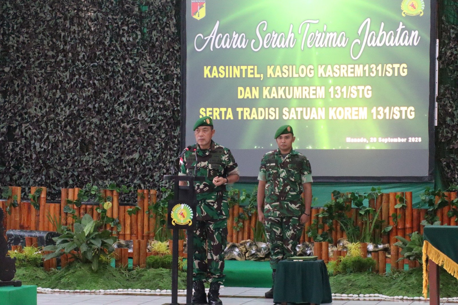 MANADO,MANADONEWS.CO.ID- Komandan Korem 131/Santiago Brigjen TNI Martin Susilo Martopo Turnip pimpin langsung Serah Terima Jabatan Kasiintel Kasrem, Kasilog Kasrem dan Kepala Hukum Korem 131/Santiago, Sabtu (20/9/2025) di Aula Santiago Makorem 131/Santiago, Kota Manado, Sulawesi Utara.
