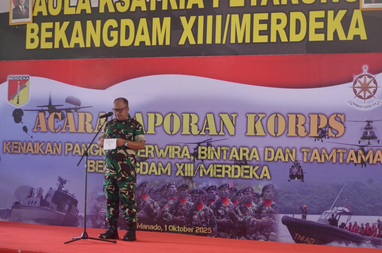 MANADO,MANADONEWS.CO.ID– Kepala Pembekalan Angkutan Daerah Militer (Kabekangdam) XIII/Merdeka Kolonel Cba Kiki Abdulrahman memimpin acara laporan Korps kenaikan Pangkat 22 prajurit Bekangdam XIII/Merdeka periode 1 Oktober 2025, Rabu (1/10/2025) di Aula Bekangdam XIII/Merdeka, Kota Manado, Sulawesi Utara.
