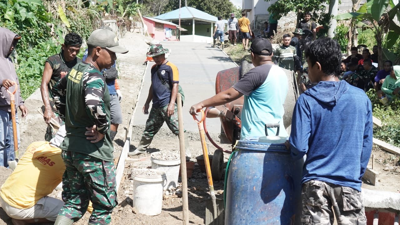 Aktivitas gotong royong tampak ramai sejak pagi di lokasi pembangunan jalan dan jembatan. Meskipun hari libur, antusiasme prajurit dan masyarakat tidak sedikit pun surut. Mereka bahu-membahu mengaduk semen, mengangkut material, dan meratakan jalan, menunjukkan sinergi yang kuat antara TNI dan rakyat.
