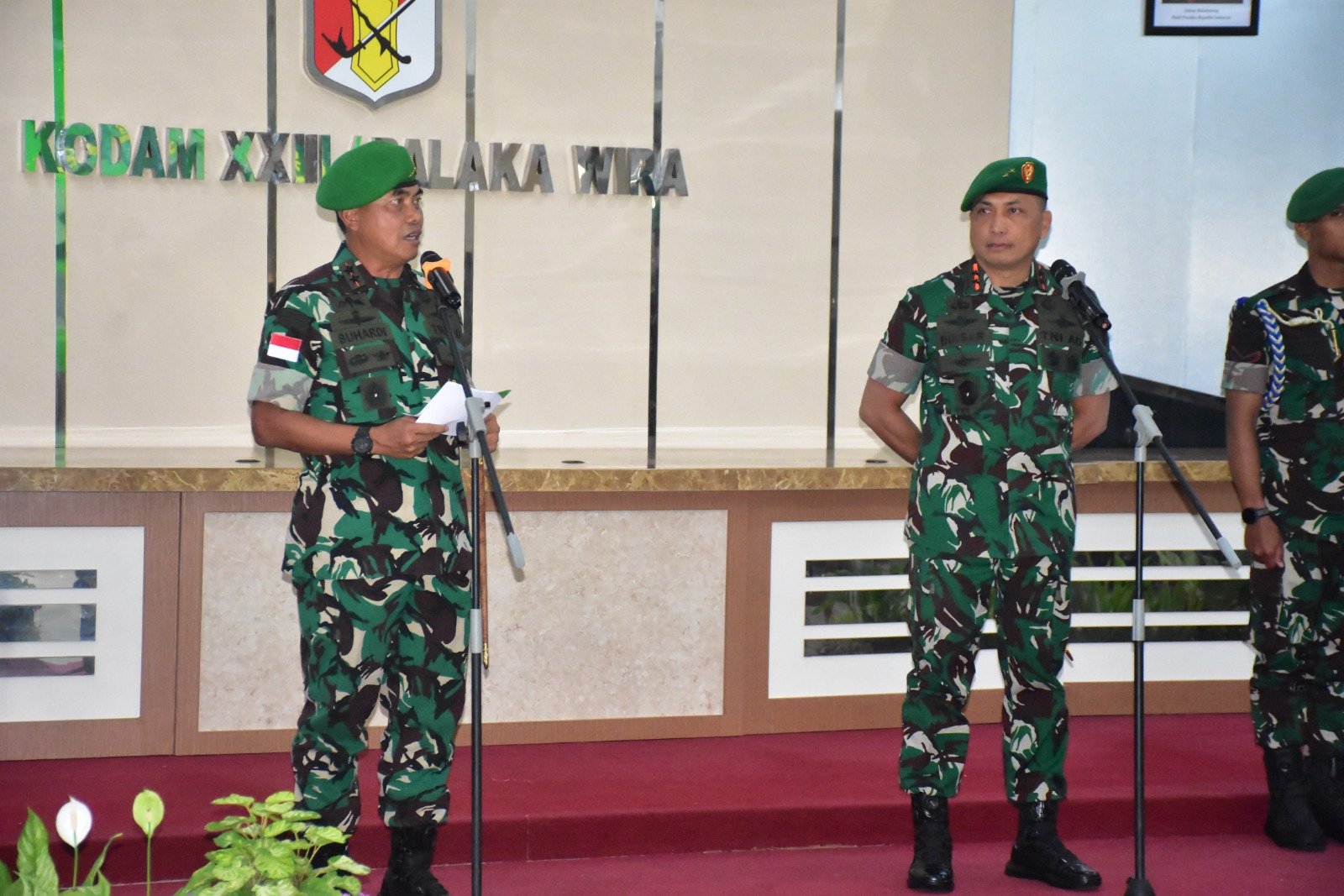 Diakhir sambutannya, Pangdam XXIII/Palaka Wira Mayjen TNI Jonathan Binsar Parluhutan Sianipar menyampaikan rasa hormat dan penghargaan yang tinggi kepada Pangdam XIII/Merdeka atas pelaksanaan pembinaan satuan di wilayah ini.