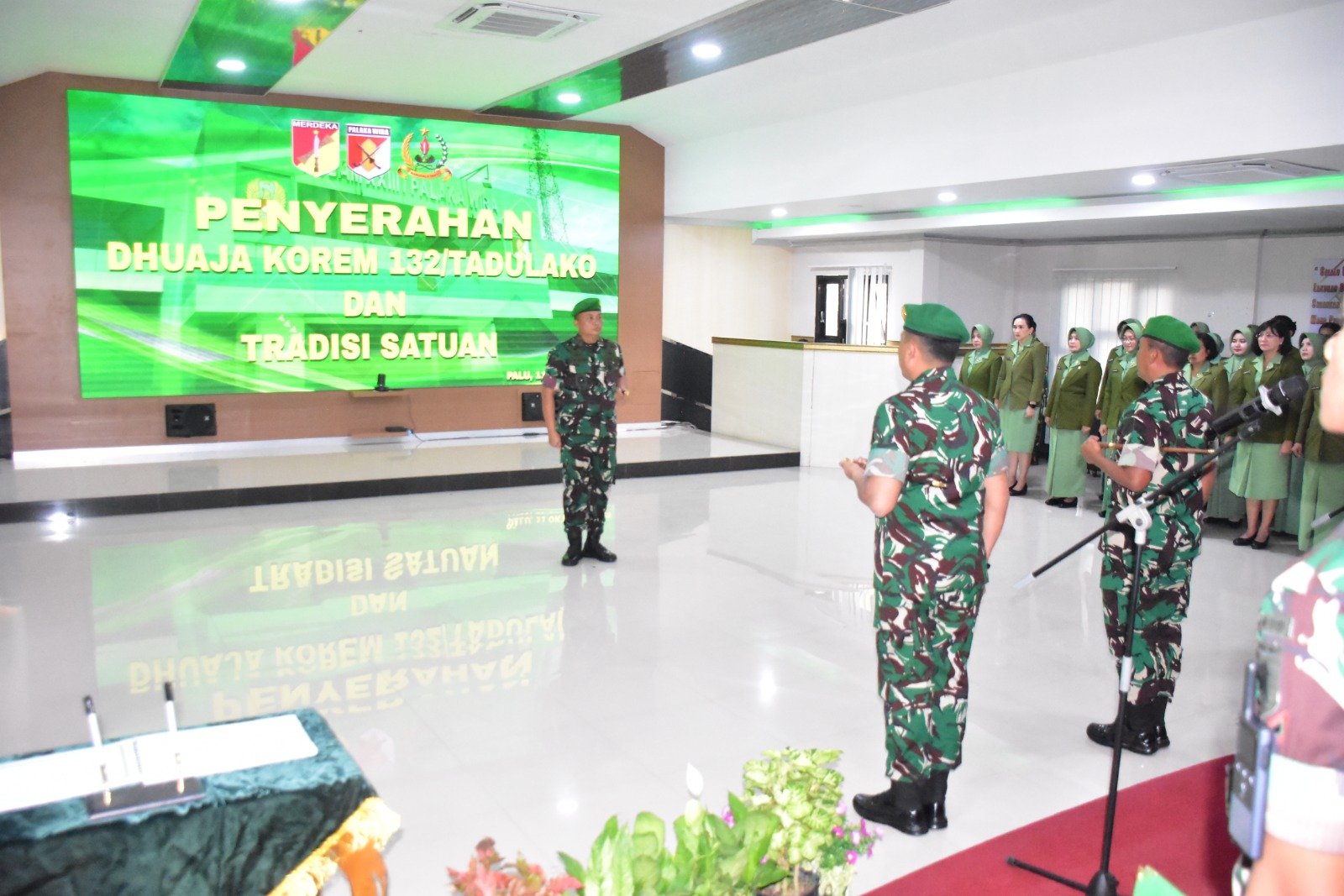 “Kepada Pangdam XXIII/Palaka Wira, saya menyerahkan Dhuaja Korem 132/Tadulako ini dengan penuh kehormatan dan kebanggaan. Dhuaja ini bukan sekadar simbol satuan, tetapi juga lambang kehormatan, semangat juang, dan pengabdian tulus prajurit Tadulako dalam menjaga kedaulatan dan keutuhan NKRI,” ujar Pangdam.