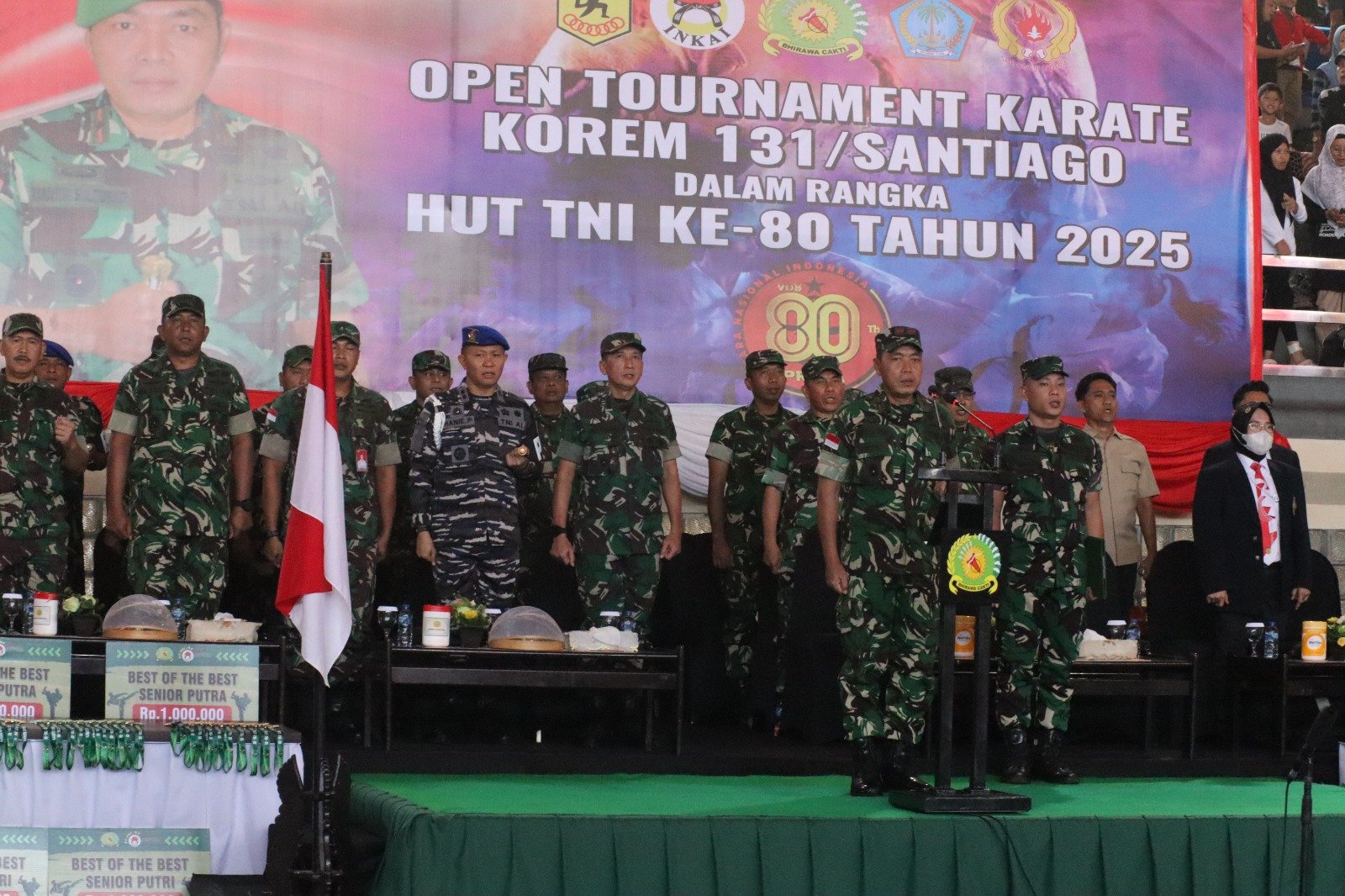 MANADO,MANADONEWS.CO.ID- Komandan Korem (Danrem) 131/Santiago Brigjen TNI Martin Susilo Martopo Turnip membuka secara resmi Open Tournament Karate Korem 131/Santiago. Kejuaraan karate yang diikuti 697 atlet dari 32 kontingen ini digelar dalam rangka Hari Ulang Tahun (HUT) ke-80 Tentara Nasional Indonesia (TNI) yang digelar di Hall B Koni Sario, Kota Manado, Sulawesi Utara, Jumat (17/10/2025).