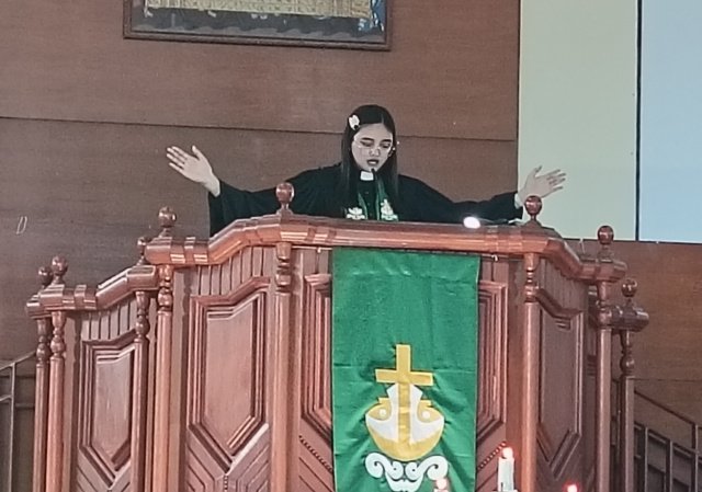 Di awal khotbah, Pendeta Friski menyambut sukacita jemaat bisa bertemu untuk beribadah.