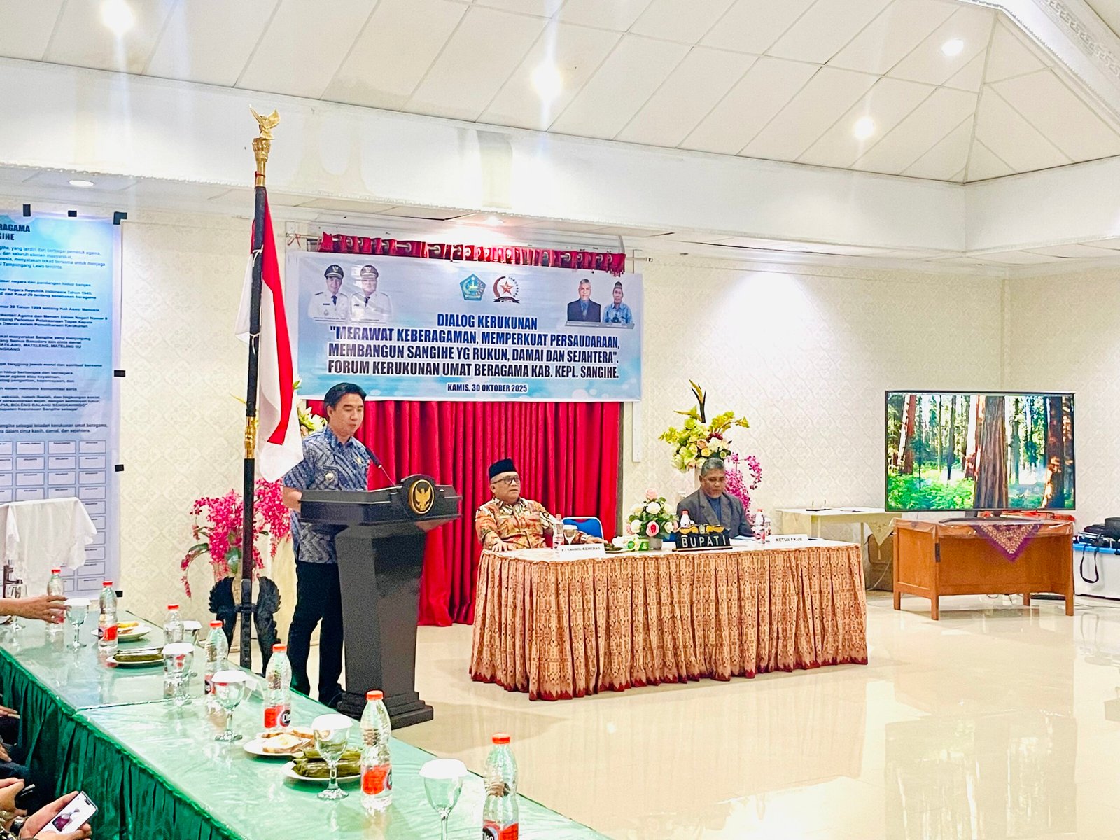 Tahuna, MANADONEWS.CO.ID — Bupati Kepulauan Sangihe, Michael Thungari, menyerukan pentingnya penguatan moderasi beragama dan ketahanan ideologi bangsa di tengah arus globalisasi dan perkembangan teknologi digital. Seruan ini disampaikannya dalam kegiatan Dialog dan Pawai Kerukunan Umat Beragama yang digelar Forum Kerukunan Umat Beragama (FKUB) Kabupaten Kepulauan Sangihe bekerja sama dengan Kementerian Agama, Kamis (30/10/2025) di Ruang Serba Guna Rumah Jabatan Bupati.