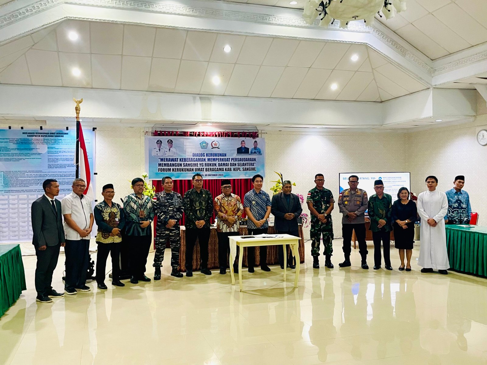 Kegiatan tersebut turut dihadiri oleh Kepala Kantor Wilayah Kementerian Agama Provinsi Sulawesi Utara, Dr. Drs. KH. Julius Taha, M.Pd, selaku narasumber utama. Hadir pula Ketua FKUB Kabupaten Kepulauan Sangihe, Pdt. Leopold Tamalawe, S.Th., M.Pd.K, unsur Forkopimda, para tokoh lintas agama, serta pemuda FKUB yang baru saja dilantik.