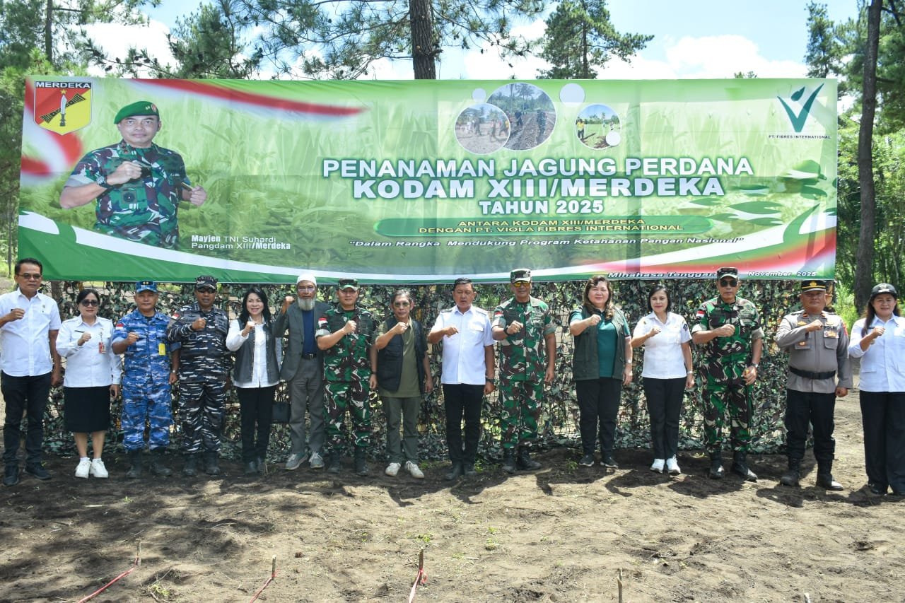 MITRA,MANADONEWS.CO.ID- Dalam upaya mewujudkan dan meningkatkan ketahanan pangan nasional, Kodam XIII/Merdeka kerjasama dengan PT. Viola Fibres Internasional menggelar program perdana penanaman jagung dan peresmian lahan ketahanan pangan di wilayah Kodim jajaran Kodam XIII/Merdeka, Rabu (26/11/2025).
