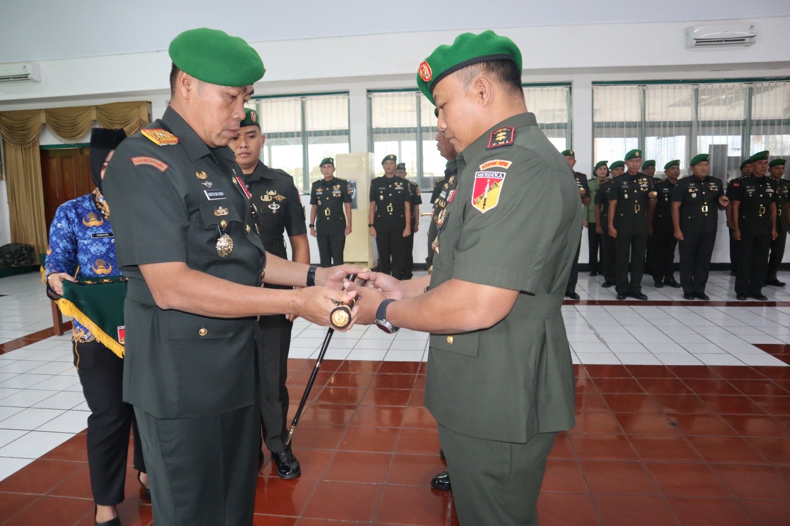 Upacara Serah Terima Jabatan (Sertijab) dipimpin langsung Komandan Korem (Danrem) 131/Santiago Brigjen TNI Martin Susilo Martopo Turnip di Aula Santiago, Makorem 131/Santiago, Kota Manado, Sulawesi Utara, Kamis (4/12/2025).