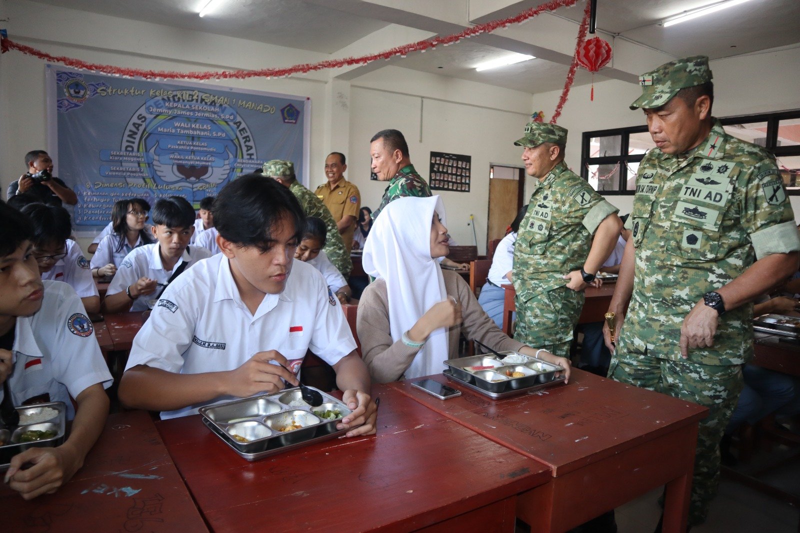 MANADO,MANADONEWS.CO.ID- Dalam rangka memastikan program nasional Makan Bergizi Gratis (MBG) berjalan secara optimal di wilayah Sulawesi Utara, Komandan Korem (Danrem) 131/Santiago Brigjen TNI Martin Susilo Martopo Turnip mendampingi Pangdam XIII/Merdeka Mayjen TNI Mirza Agus meninjau langsung pelaksanaan Program Makan Bergizi Gratis (MBG) di SMA N 1 Manado, Kecamatan Sario, Kota Manado, Senin (15/12/2025).
