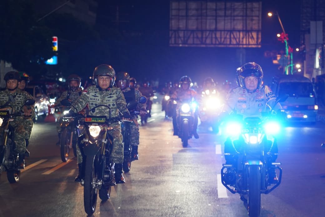 MANADO,MANADONEWS.CO.ID- Pangdam XIII/Merdeka Mayjen TNI Mirza Agus bersama Kapolda Sulut Irjen Pol Roycke Harry Langie menggelar patroli jalanan Pengamanan Malam Tahun Baru, Rabu (31/12/2025) malam di wilayah Kota Manado, Sulawesi Utara.