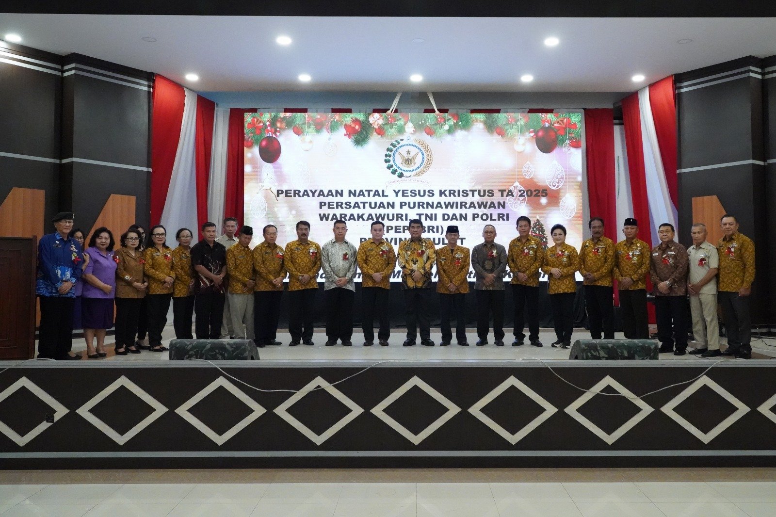 MANADO,MANADONEWS.CO.ID- Pangdam XIII/Merdeka Mayjen TNI Mirza Agus bersama Kasdam XIII/Merdeka Brigjen TNI Yustinus Nono Yulianto menghadiri perayaan Natal Persatuan Purnawirawan Warakawuri, TNI dan Polri (PEPABRI) Provinsi Sulawesi Utara, bertempat di Grhadika Jaya Sakti Makodam XIII/Merdeka Kota Manado, Sulawesi Utara, Sabtu (10/1/2026).