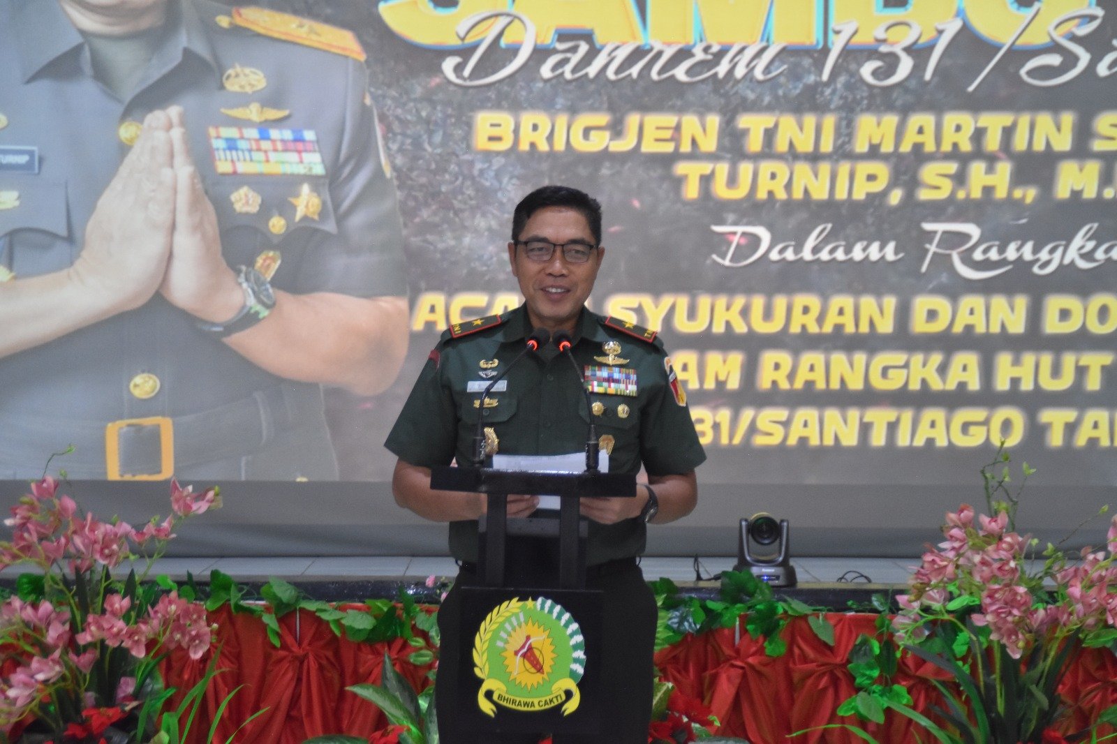 Komandan Korem 131/Santiago Brigjen TNI Martin Susilo Martopo Turnip dalam sambutannya menyampaikan bahwa Hari Ulang Tahun ke-62 Korem 131/Santiago tahun 2026 ini dilaksanakan terbilang secara terbatas dan sederhana.