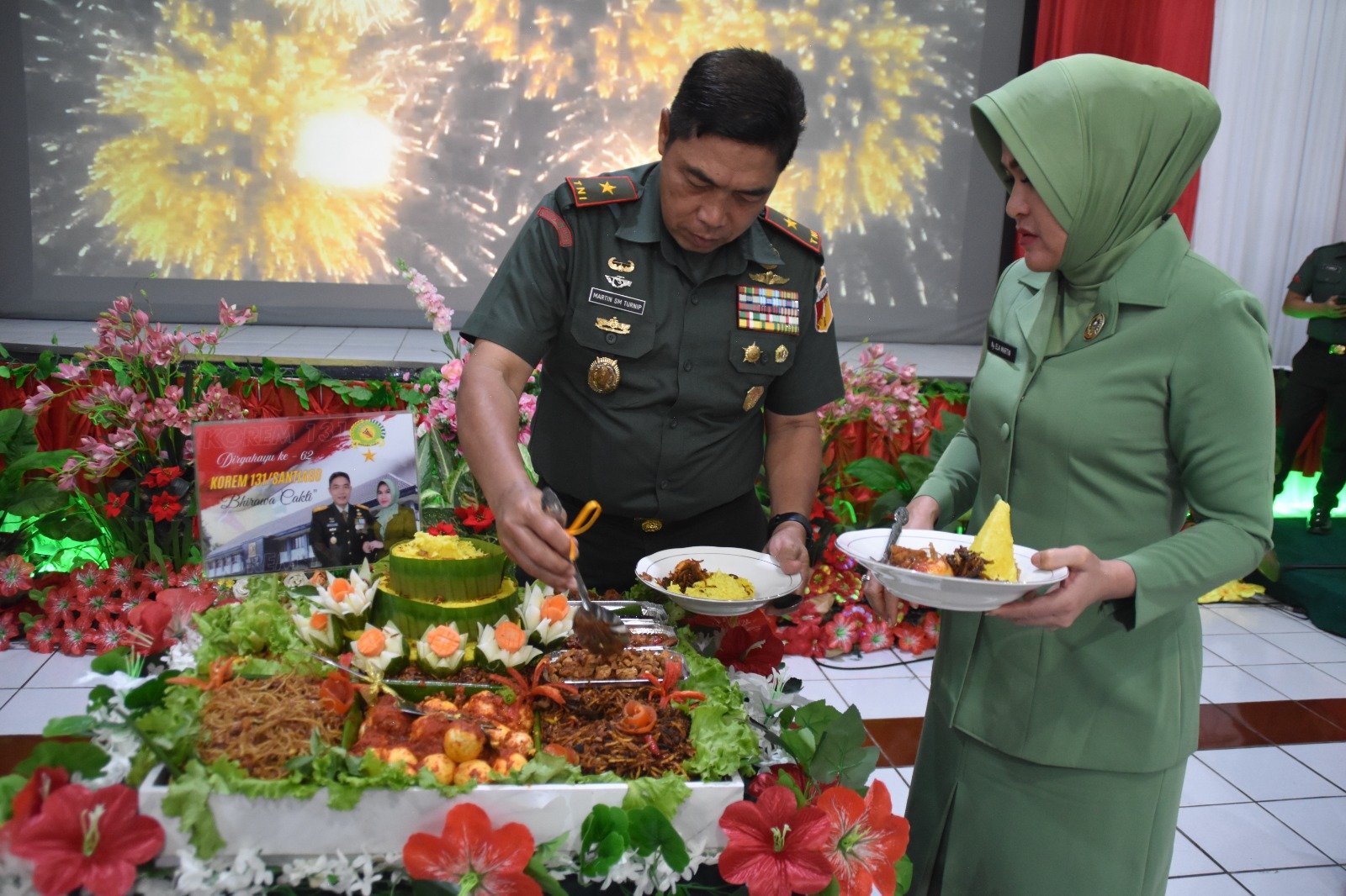 Pada kesempatan itu, Danrem 131/Santiago didampingi Ketua Persit KCK Koorcabrem 131 PD XIII/Merdeka bersama Kasrem 131/Santiago melaksanakan pemotongan Tumpeng, yang selanjutnya diberikan kepada prajurit tertua di jajaran Korem 131/Santiago Kapten Inf Aldewied Gansa dan prajurit termuda Prada Irzandi Pilat M. Bunaen