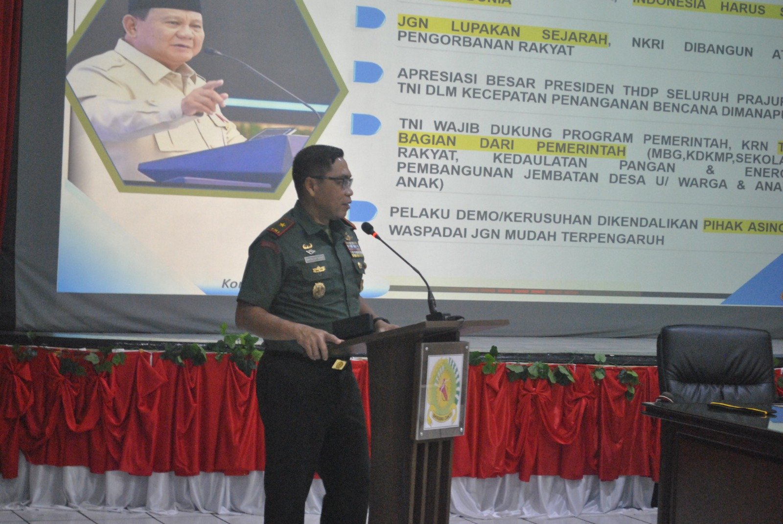 Lebih lanjut, Danrem menyampaikan, bahwa TNI wajib memberikan dukungan penuh terhadap berbagai program strategis pemerintah termasuk Makan Bergizi Gratis (MBG), Koperasi Desa Kelurahan Merah Putih (KDKMP), Sekolah Rakyat, Kedaulatan pangan dan energi, serta pembangunan jembatan.