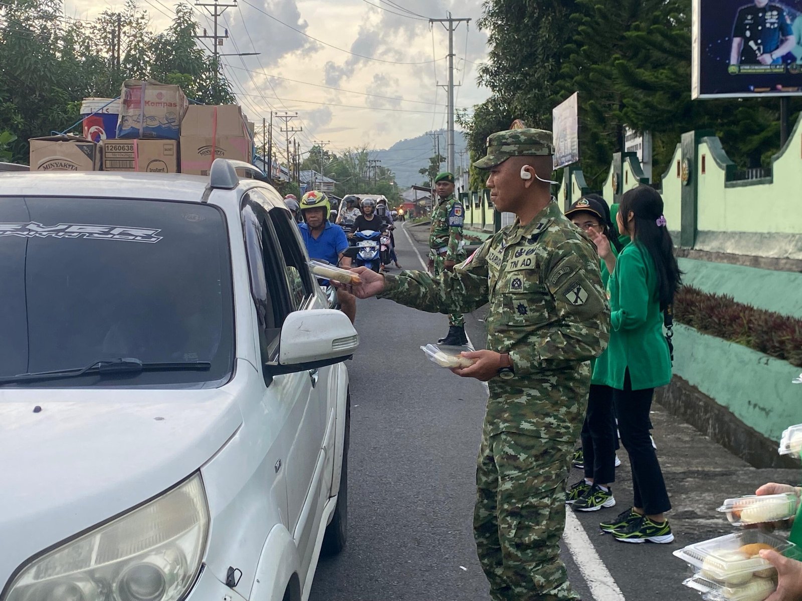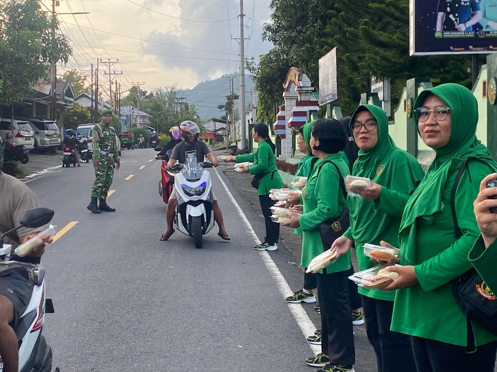 Pembagian takjil dilakukan kepada pengendara dan masyarakat yang melintas menjelang waktu berbuka puasa. Kehadiran para prajurit TNI dan anggota Persit yang turun langsung ke jalan membagikan paket takjil disambut antusias oleh warga.