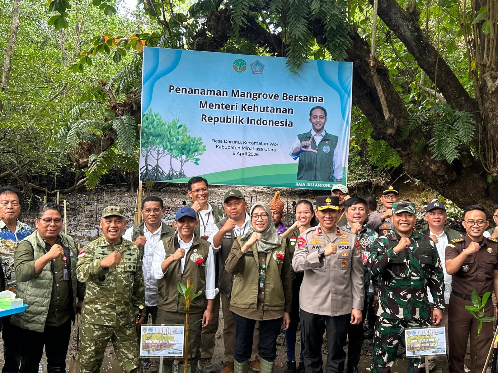 MINUT,MANADONEWS.CO.ID- Pangdam XIII/Merdeka Mayjen TNI Mirza Agus mendampingi Menteri Kehutanan Raja Juli Antoni menanam mangrove di Mangrove Park Areal Lembaga Pengelola Hutan Desa (LPHD) Dariaga Mudae, Desa Darunu, Kecamatan Wori, Kabupaten Minahasa Utara (Minut), Sulawesi Utara, Kamis (9/4/2026).