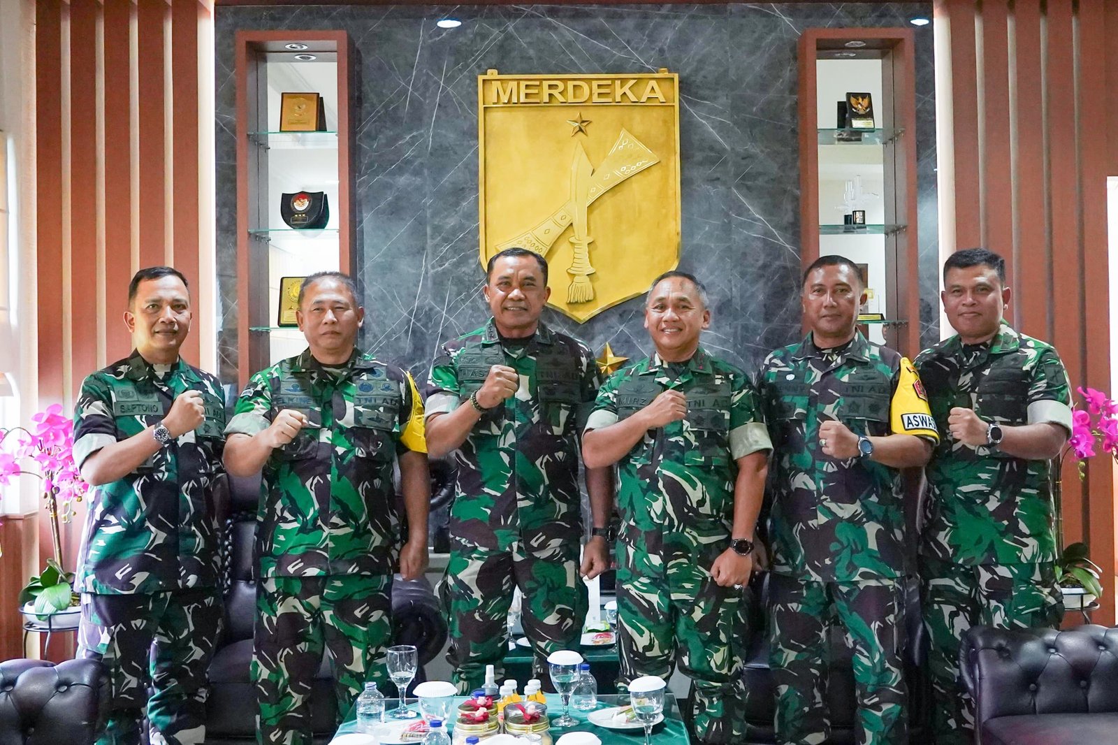 MANADO,MANADONEWS.CO ID- Panglima Kodam XIII/Merdeka Mayjen TNI Mirza Agus menerima kunjungan Komandan Komando Pendidikan dan Latihan (Dankodiklat) TNI AD Letjen TNI Mohamad Hasan bersama rombongan Aswaslat Kodiklatad di Makodam XIII/Merdeka, Kota Manado, Sulawesi Utara, Senin (20/4/2026).